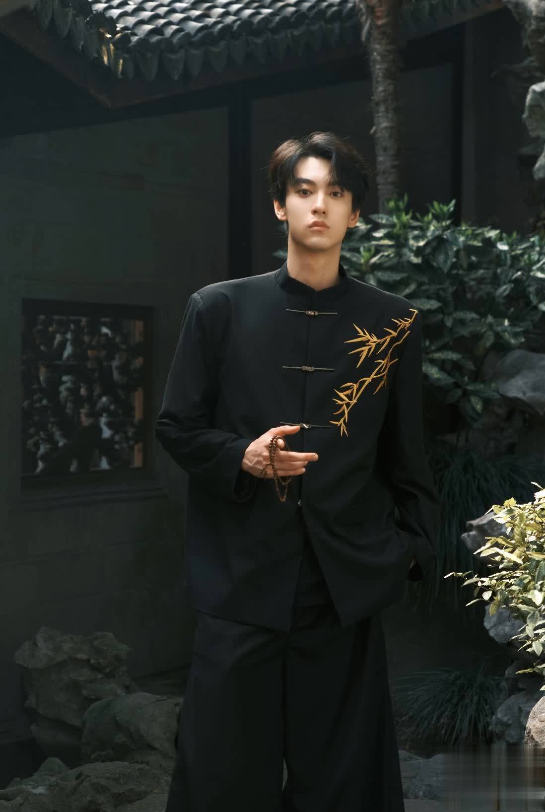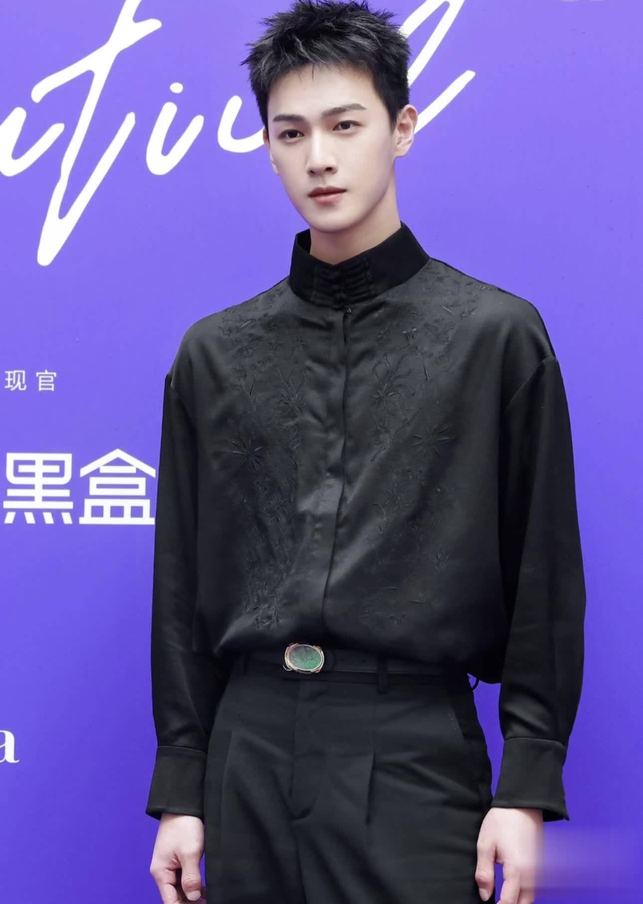李昀锐身穿黑色缎面衬衫也有非常多的东方元素,除了常见的盘扣和刺绣工艺之外,还有暗纹工艺,虽然是都是黑色系,但细看精致非凡,低调的奢华具象化~