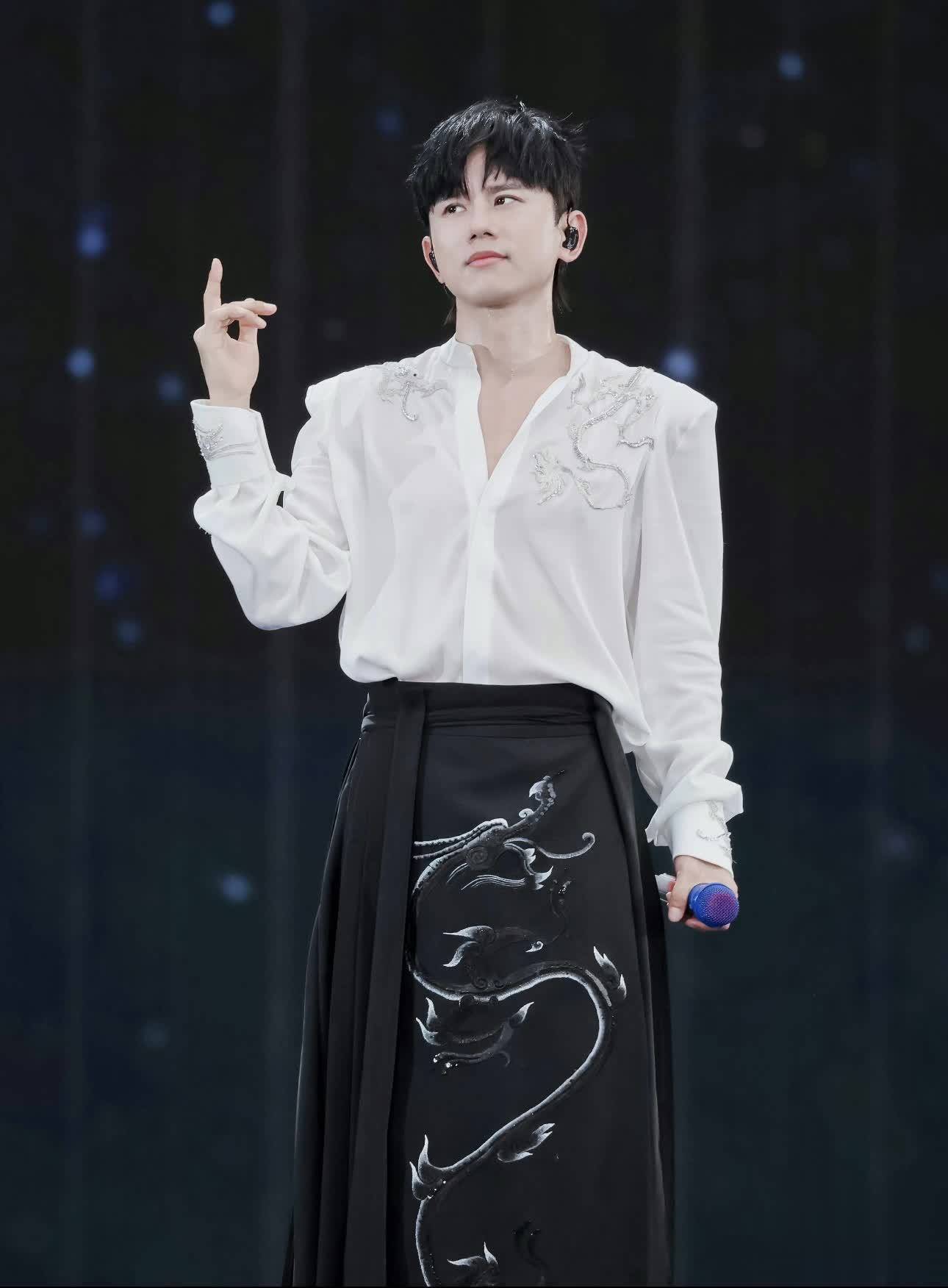 张杰的演唱会上造型选择了国风衬衫和马面裙,白色立领衬衫的肩上和袖口处点缀着银龙刺绣,细节处理到位,满满的重工打造。下身搭配的是中国传统服装马面裙,独属于东方繁复主义的穿搭。