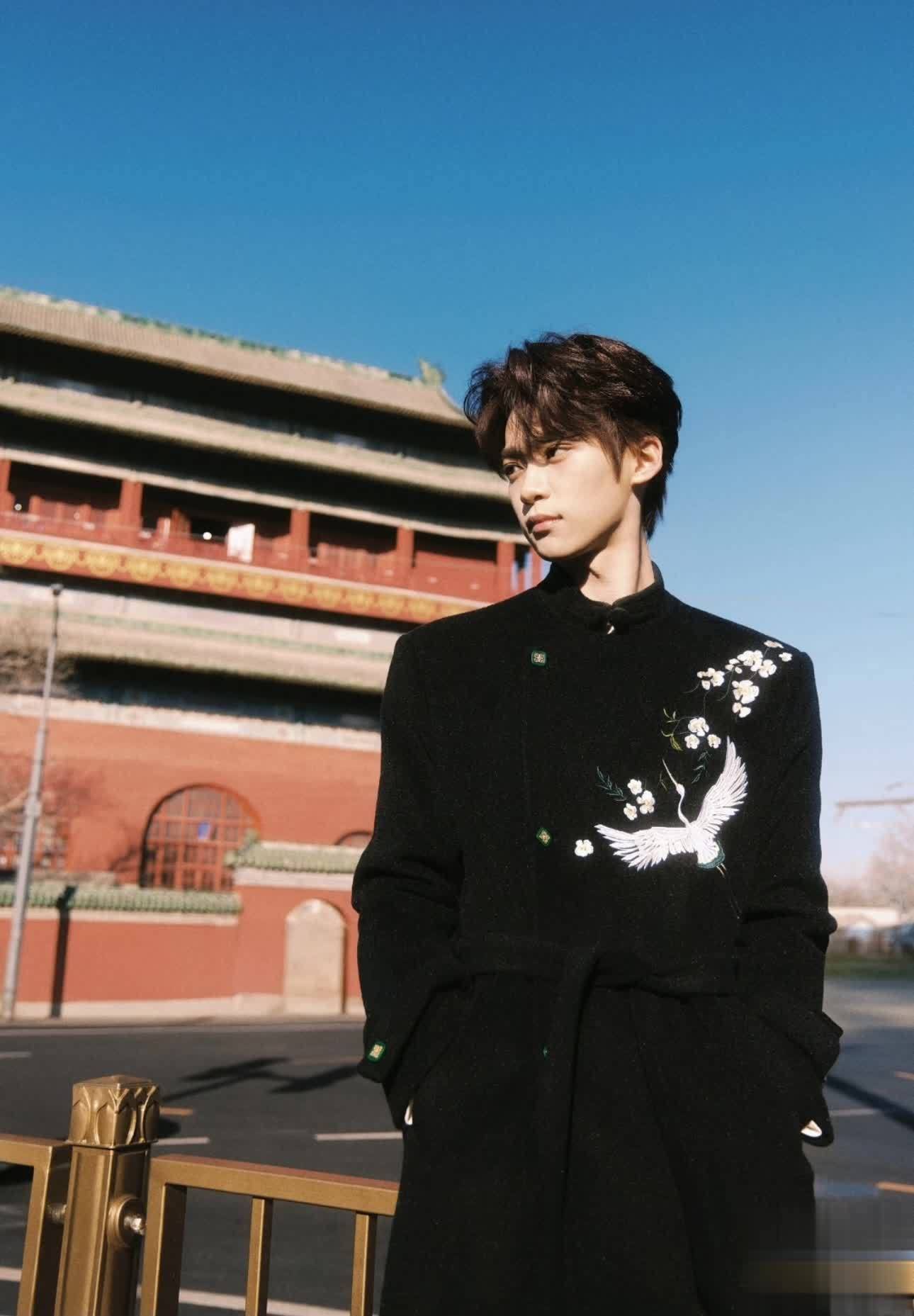 今年爆火的小生田栩宁一袭黑色西服,西服上的金竹刺绣和金属搭扣精致且重工,黑金配色大气又自带时尚休闲。